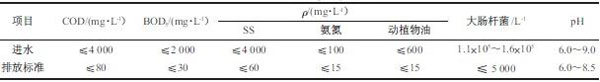 廢水產(chǎn)生有明顯的不連續(xù)性,每個(gè)季節(jié)以及每天的不同時(shí)段都不相同,節(jié)假日產(chǎn)生量較大,廢水中含有大量的血污、骨屑、肉屑、內(nèi)臟、腸容物以及糞便等污染物,固體懸浮物含量較高,有機(jī)物濃度高,油脂含量大,廢水呈紅褐色并有腥臭味,屬于較典型的有機(jī)污水,可生化性好。廢水處理設(shè)計(jì)**大進(jìn)水量為6 000 m3/d,平均水量為250 m3/h。處理后達(dá)到肉類(lèi)加工工業(yè)水污染物排放標(biāo)準(zhǔn)(GB 13457-92)中畜類(lèi)屠宰加工一級(jí)排放標(biāo)準(zhǔn)。具體進(jìn)水水質(zhì)及排放標(biāo)準(zhǔn)如表1 所示。