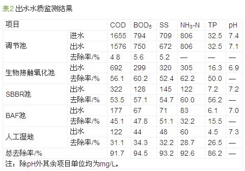 由于豬場(chǎng)沼液的碳氮比低,可生化性差,不適合微生物生長(zhǎng),故定時(shí)向廢水中添加一定量的營(yíng)養(yǎng)物,以提高B/C。系統(tǒng)運(yùn)行至今,各單元處理效果穩(wěn)定,經(jīng)生物接觸氧化、SBBR、BAF、人工濕地處理后,出水水質(zhì)可滿足《畜禽養(yǎng)殖業(yè)污染物排放標(biāo)準(zhǔn)》(GB 18596—2001)中的相關(guān)要求,監(jiān)測(cè)結(jié)果見(jiàn)表2。