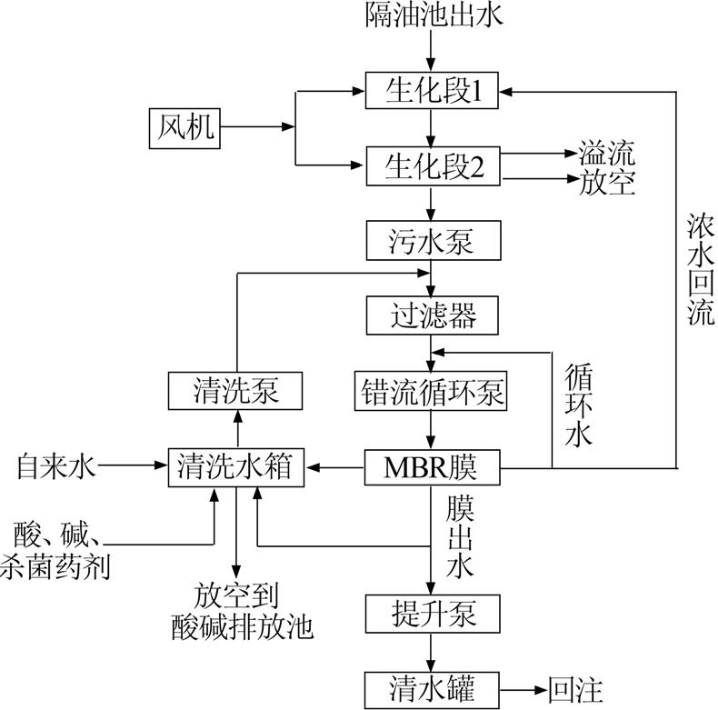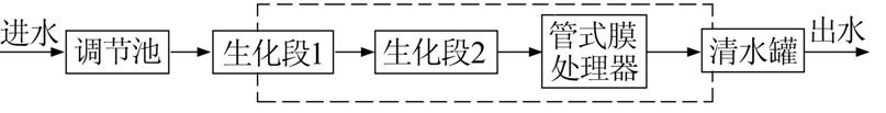 圖 1中回注水處理工藝流程中虛線部分為車載部分。工藝流程重點對工藝流程生化段1、生化段2、管式膜處理器詳細(xì)說明〔2, 3, 4〕,具體工藝流程見圖 2。