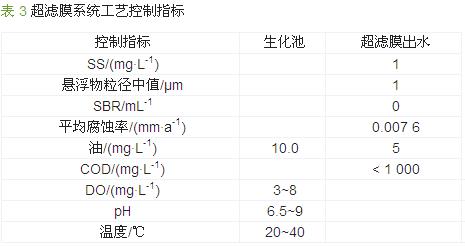 超濾膜采用德國BERGHOF膜組件,膜道8 mm,膜孔30 nm。經(jīng)生化處理后的含油廢水由進(jìn)水泵打入超濾膜系統(tǒng),膜系統(tǒng)產(chǎn)水經(jīng)轉(zhuǎn)子流量計計量后排入凈水罐,部分濃水回流至生化系統(tǒng),部分濃水由循環(huán)泵與進(jìn)水混合重新進(jìn)入超濾膜〔7〕。超濾膜處理系統(tǒng)流程見圖 3。工藝控制指標(biāo)見表 3。