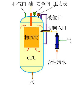 CFU工作原理如圖 1所示。采出水主體水流先經(jīng)自制的微氣泡發(fā)生器注入大量的微氣泡,然后沿切向入口進(jìn)入浮選罐,在罐壁與內(nèi)部穩(wěn)流筒之間形成的環(huán)形空間內(nèi)產(chǎn)生旋流,旋流引起的離心力場(chǎng)驅(qū)使氣泡與油滴**黏附,黏附氣泡后的油滴與水的密度差進(jìn)一步加大,進(jìn)而加速浮升,提高了油水分離效率,實(shí)現(xiàn)對(duì)生產(chǎn)水的**處理,同時(shí)大大縮短水力停留時(shí)間,減小了處理設(shè)備的尺寸。其中,自行研制的微氣泡發(fā)生器利用微孔發(fā)泡機(jī)理,通過(guò)微孔對(duì)氣流進(jìn)行連續(xù)剪切后經(jīng)水流沖刷而形成微氣泡,有效規(guī)避了常規(guī)氣泡發(fā)生方式能耗高、產(chǎn)生氣泡性能差、剪切乳化程度高等不足〔4, 5, 6〕,微氣泡發(fā)生器的優(yōu)越性能也為CFU除油效率的提高提供了保障