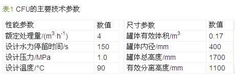 CFU的浮選罐外形尺寸為D 0.4 m×1.7 m,微氣泡發(fā)生器外形尺寸為D 76 mm×700 mm?,F(xiàn)場(chǎng)試驗(yàn)時(shí)CFU采用2個(gè)立式氣浮罐串聯(lián)成撬,總體尺寸為1 430 mm×1 200 mm×2 370 mm,凈重≤1.5 t。其他參數(shù)如表 1所示。