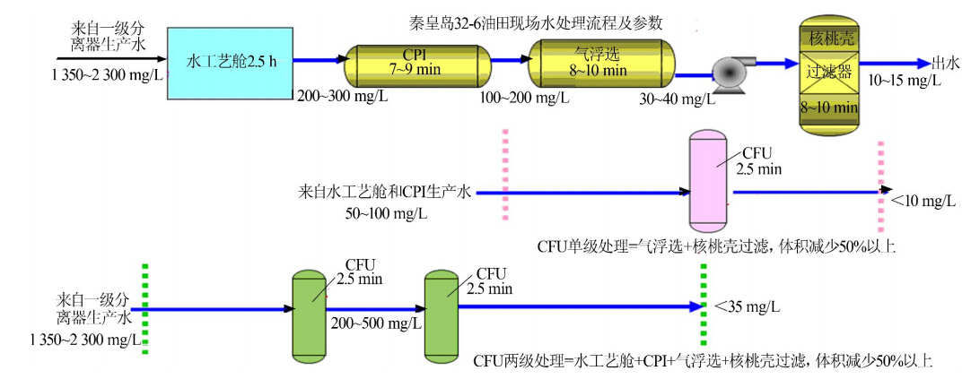 由圖5可以看出,單級(jí)CFU在入口含油50~100 mg/L、水力停留時(shí)間2.5 min時(shí)的處理效果與現(xiàn)場(chǎng)應(yīng)用氣浮選+核桃殼過(guò)濾相當(dāng),設(shè)備體積可減少50%以上;采用兩級(jí)CFU串聯(lián),在入口含油1 350~ 2 300 mg/L、總水力停留時(shí)間為5 min時(shí)的處理效果與現(xiàn)場(chǎng)應(yīng)用水工藝艙+斜板除油器+氣浮選+核桃殼過(guò)濾的效果相當(dāng),設(shè)備體積可減少50%以上。顯然,采用CFU可以減少水處理設(shè)施的串聯(lián)級(jí)數(shù)或大大減小設(shè)備體積,這對(duì)于海上油田而言極具應(yīng)用優(yōu)勢(shì)。